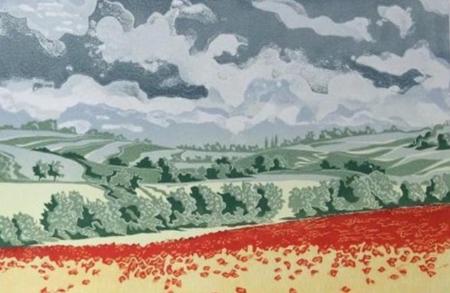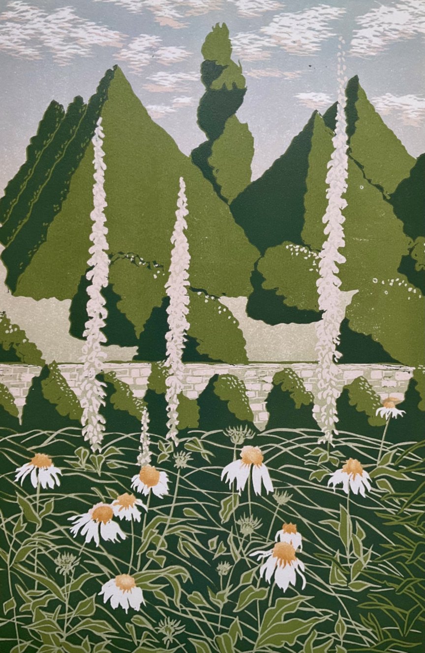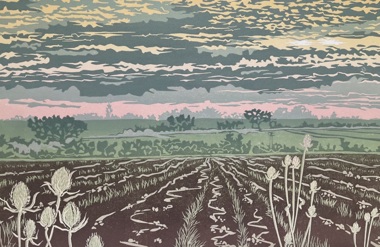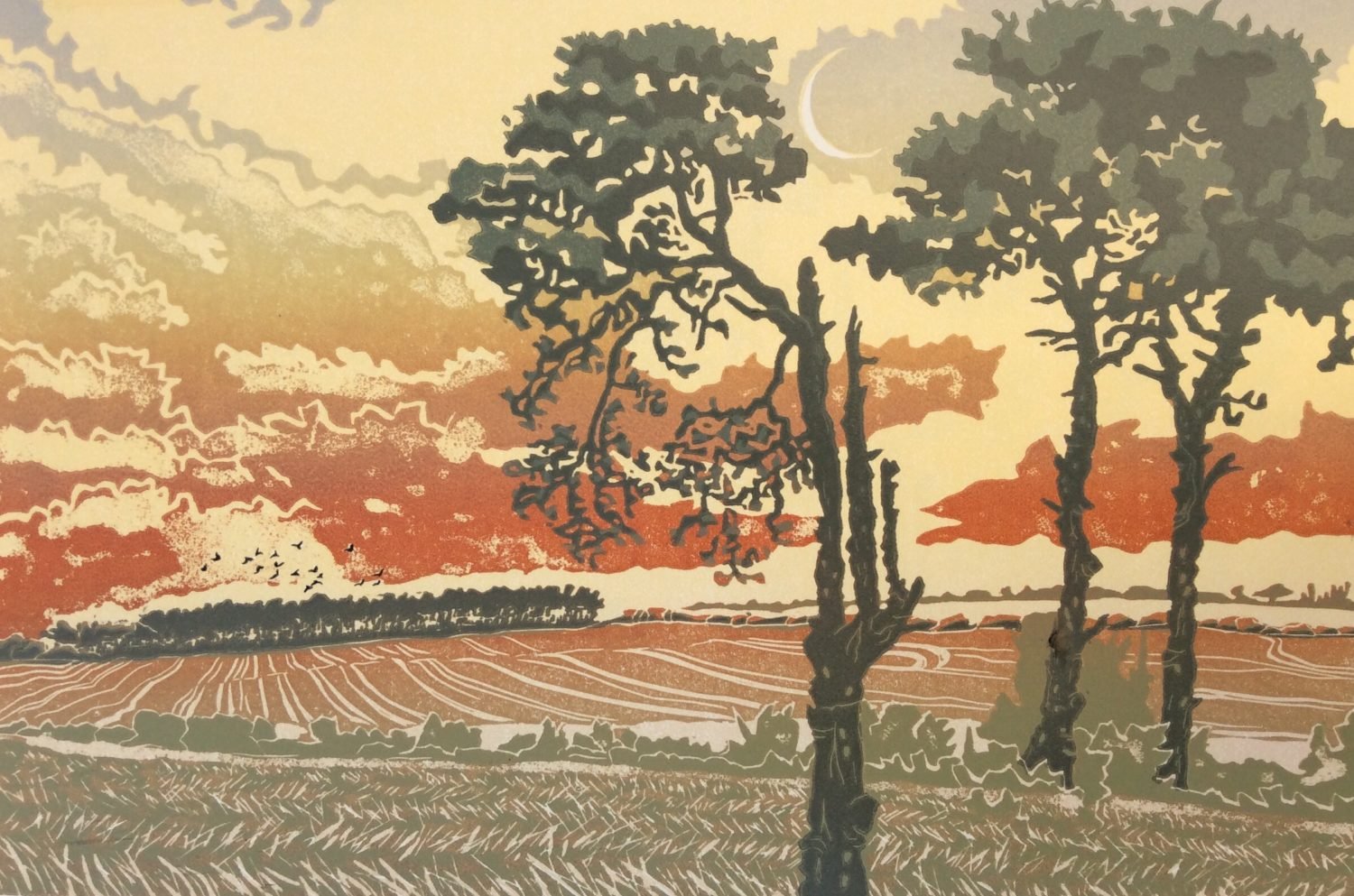 My favourite mediums, particularly when working with landscape, had always been watercolour often combined with charcoal, but more recently I became involved with printing techniques, specifically linocutting. Carving my designs into lino blocks gives me satisfyingly graphic images, which I am continuing to exploit and explore. I have an Albion printing press in my studio at home where I can experiment and further develop my art through printmaking.