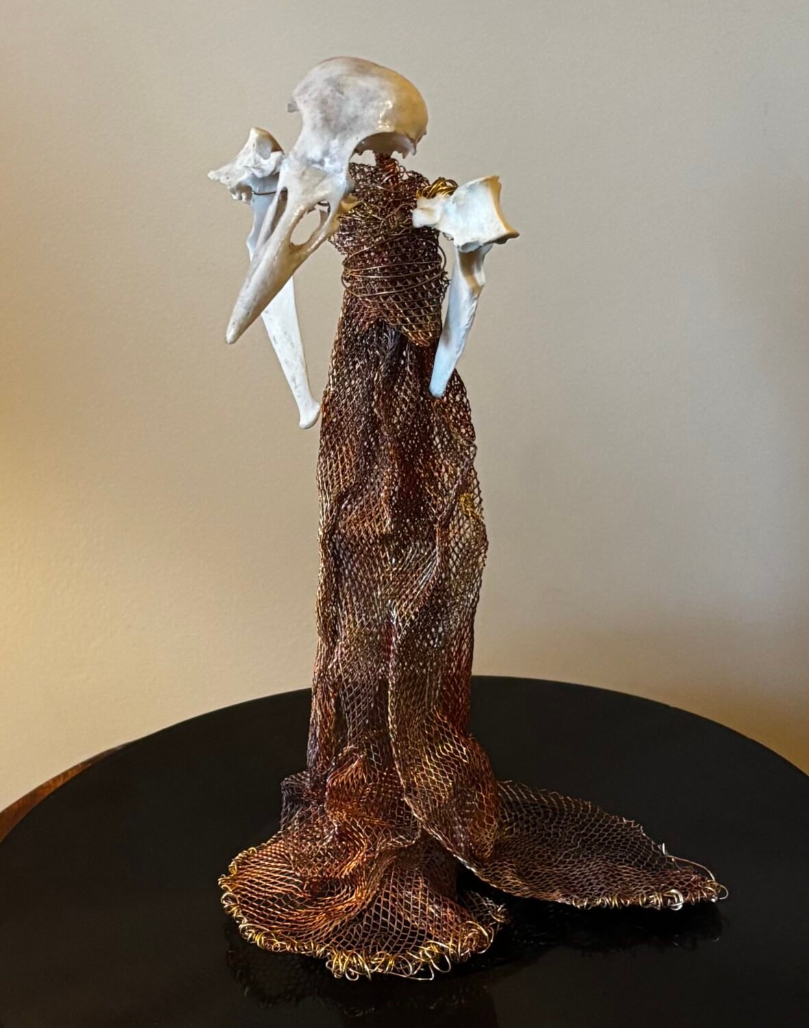 Crystals have long since been involving themselves in my life. I have often kept one about my person and have used crystals whilst giving treatments in the days when I was a professional Reflexologist and Reiki Healer. Now being able to add them to my wearable art is a real joy for me. Gemstones, both precious and semiprecious, mixed metals, texture and patination are favourite features in many of my works. Found objects, picked up from beaches to carparks, may also find themselves alongside the more precious materials. Mixing it together is great fun. Responsibly sourced animal artefacts, those gathered up from naturally deceased carcasses are also materials that I keep in the studio for when the mood takes me. These bones and delft clay castings taken from them are what I refer to as ‘Wayside’ pieces. These found materials are also making their way into my other artistic works of collage and sculpture.