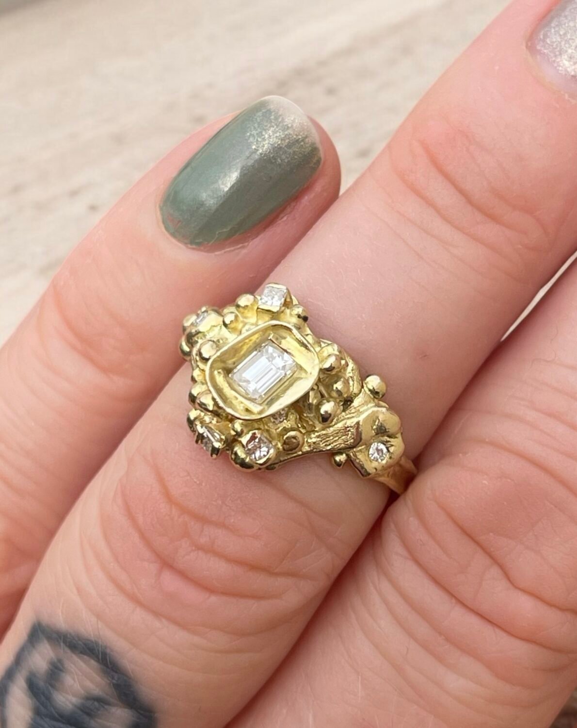 The majority of my work has been created using recycled silver and gold. I am currently in the process of replenishing my gemstones from traceable and ethically mined sources.
