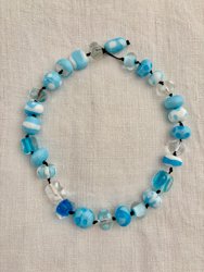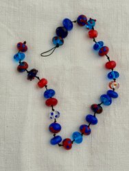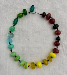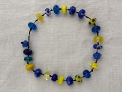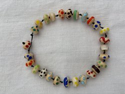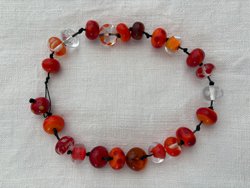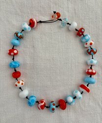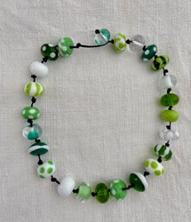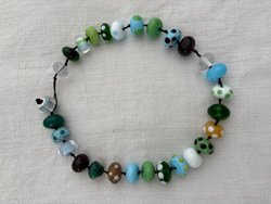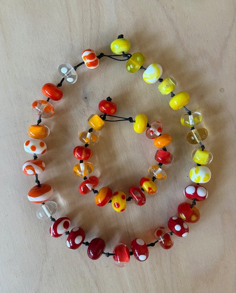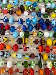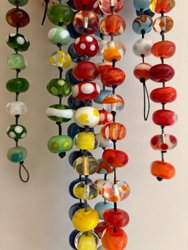 I use the Flamework process with Murano glass rods to form my beads and thread them with waxed cotton.