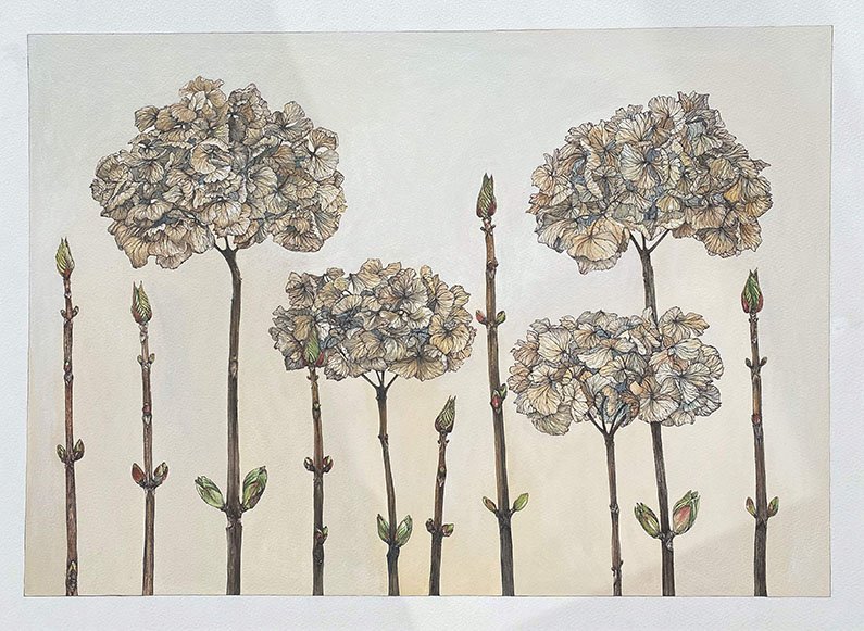 These days, I paint from a pink cottage in the Suffolk countryside, where the changing seasons, my garden in full bloom, coastal walks and local wildlife constantly inspire me. I’m drawn to colour, movement and the small details that make the natural world so alive. Whether it’s the twist of a vine, the curve of a shell, or the light on the water, I try to capture what catches my eye and brings me joy.