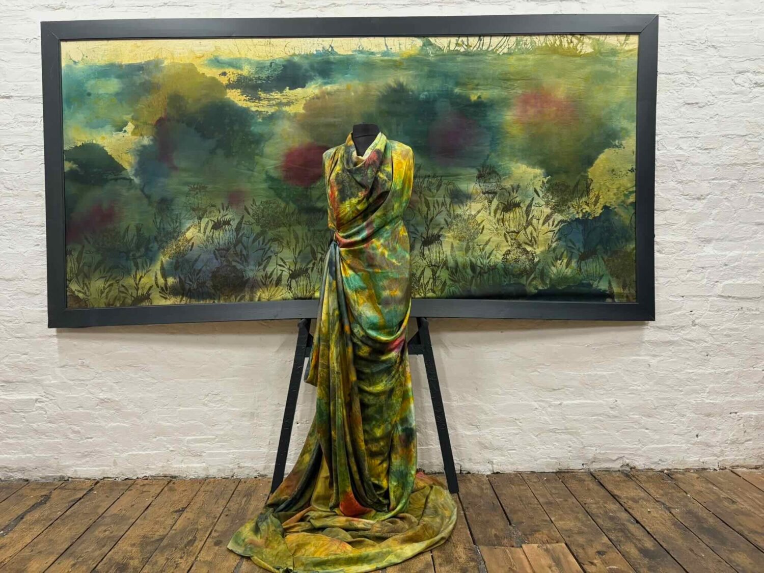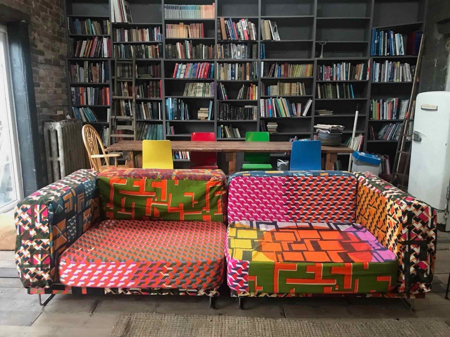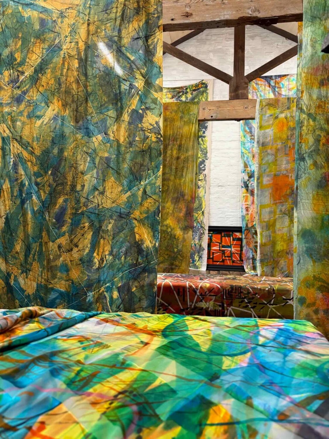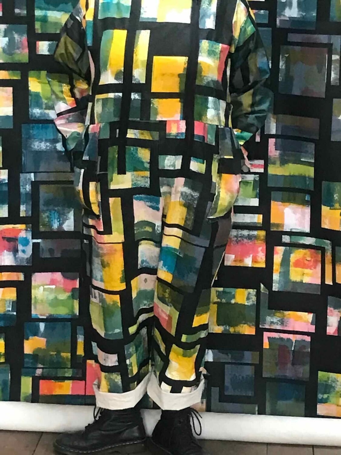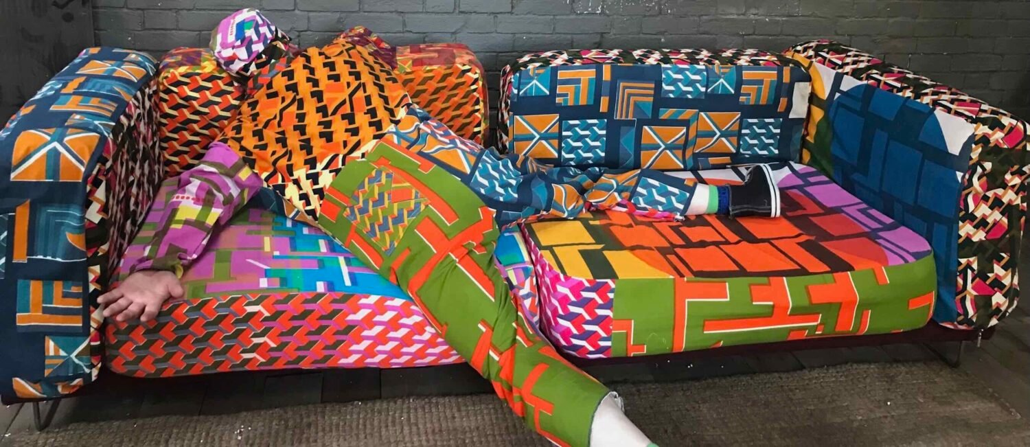Textile designer Annie Gough creates dynamic,colourful fabrics for use in interiors and fashion. Using screen printing Annie creates large scale functional art pieces. Her previous works included a collection of geometric patterns inspired by the colours and shapes of beach huts near her coastal home, these geometric patterns blended with the background to confuse the eye. This work featured a boiler suit and sofa wittily creating a visual effect named ‘Glamouflage’. Annie has recently finished an MA in Textile Design at Norwich University of The Arts and is now focusing on setting up her screen printing studio in Lowestoft.