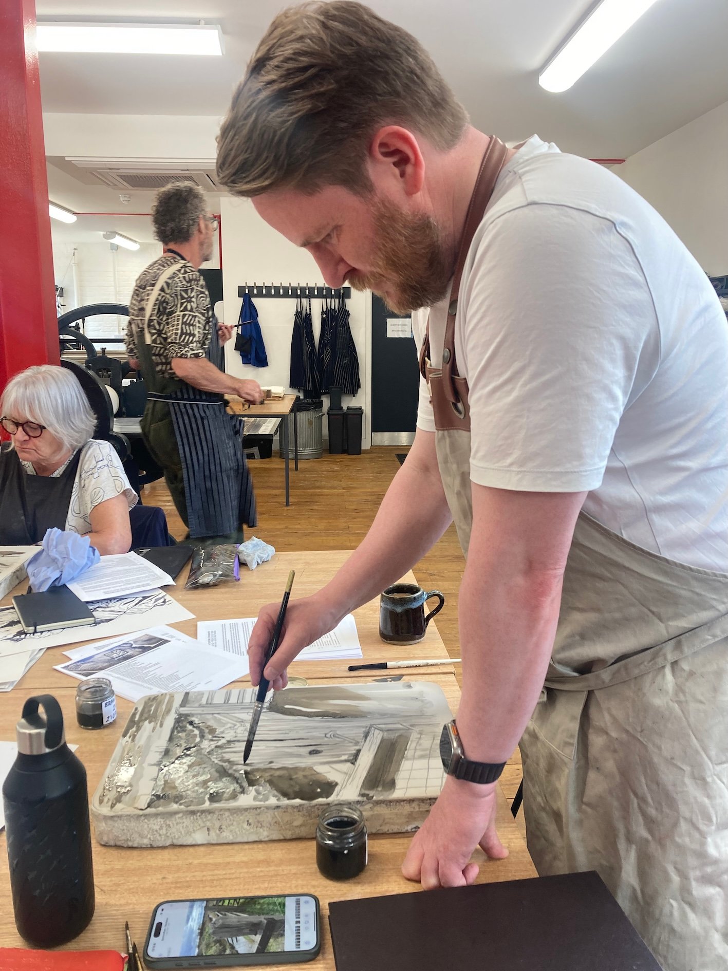 An opportunity to study Lithography in depth. The aim of the course is to provide a structured syllabus throughout a twelve-month period which seeks to give participants a firm technical grounding in the techniques of lithography on stone, alongside the opportunity to experience a diverse range of intermediate and advanced techniques in Stone Lithography. This includes 12 x studio days, exhibition hanging day, Exhibition Opening & Private View, plus the opportunity for further studio days.